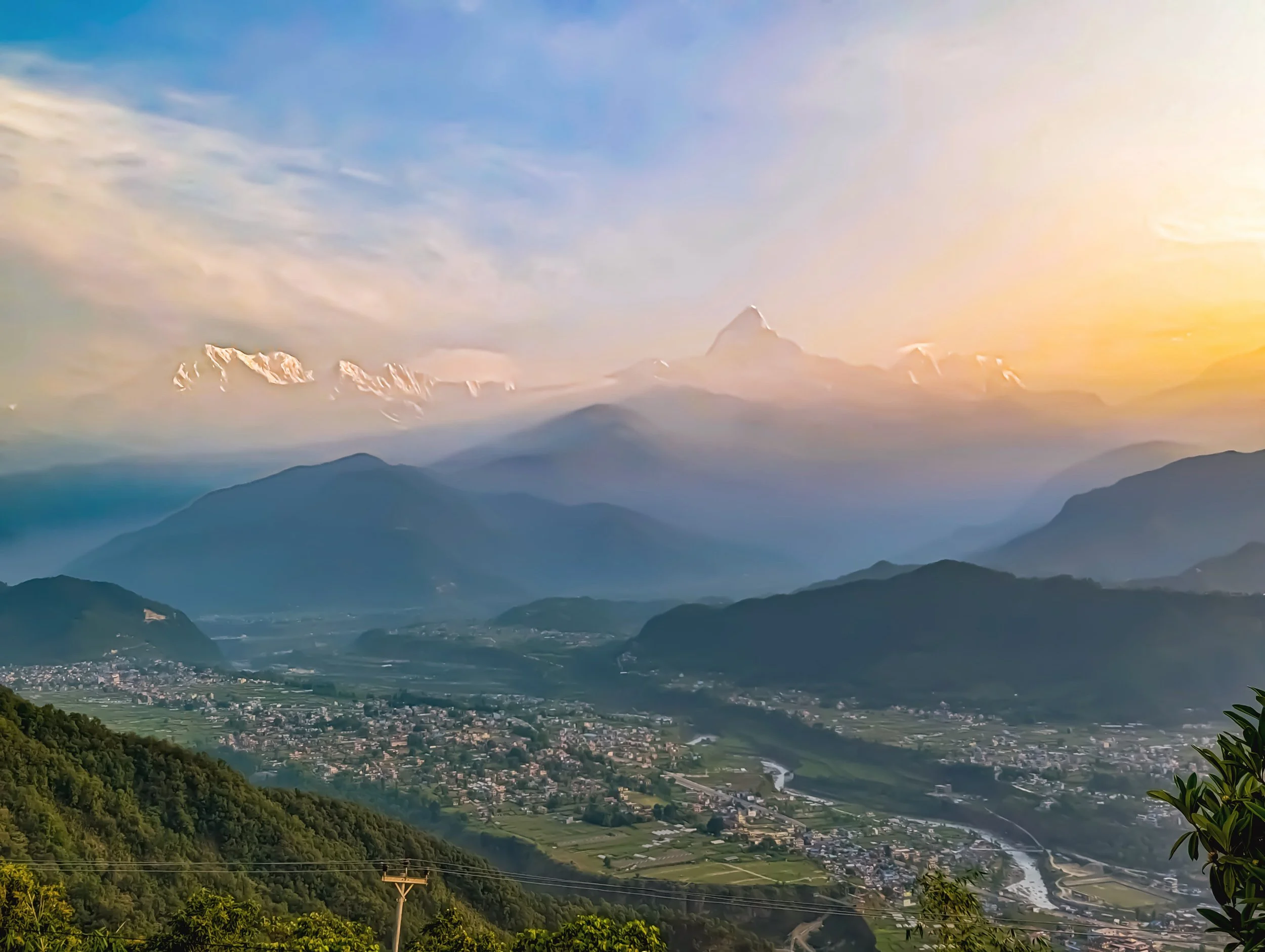 One morning, we woke before dawn and made our way to a hilltop viewpoint to witness the sunrise over the Annapurna mountain range. As the minutes passed, more people arrived, but we managed to secure the perfect spot. When the sun finally emerged from behind the mountains, casting shades of gold, pink, and blue across the sky, the entire crowd, myself included, gasped in awe. It was a truly breathtaking moment and one I will cherish forever.